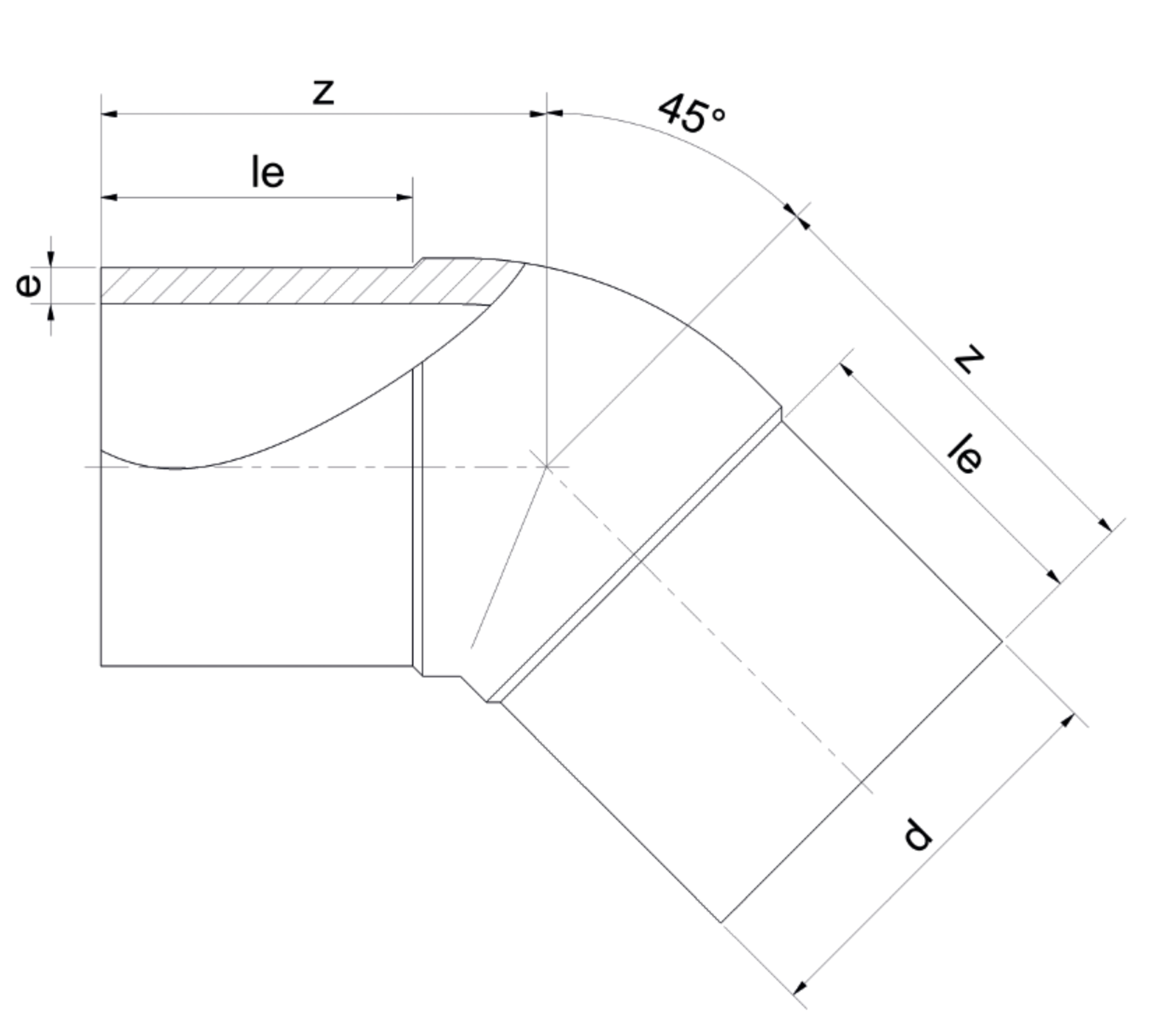 SDR 11 d (mm) 180 e (mm) 16,4 le1 (mm) 141 z1 (mm) 196 PN 16 Angle 45 Weight (kg) 3,45
